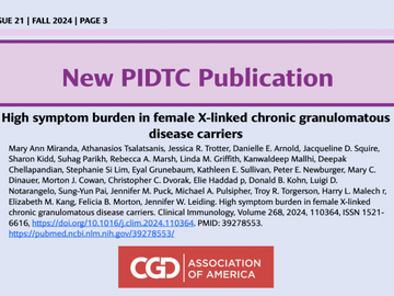 The CGD Association of America's recently published article in "Clinical Immunology" regarding X-linked female carriers of CGD was featured in the November issue of Primary Immune Deficiency Treatment Consortium's (PIDTC) Newsletter.