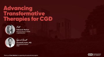 The CGDAA hosted an exclusive webinar exploring the latest advancements in transformative therapies for Chronic Granulomatous Disease (CGD). This event featured Dr. Donald Kohn, UCLA Professor of Microbiology, Immunology, and Molecular Genetics, renowned for his expertise in gene therapy for CGD, alongside Felicia Morton, Founder and Executive Director of CGDAA. Dr. Kohn shared cutting-edge insights into transformative therapy options, followed by an interactive Q&A session. Watch here.